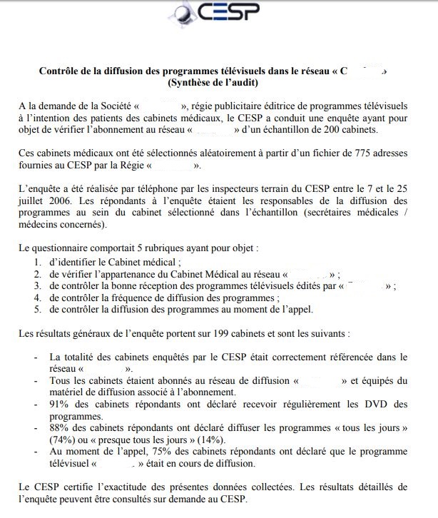 Un exemple de synthèse d'audit d'un réseau publicitaire spécialisé dans la diffusion en salles d'attente médicales (wait marketing) :