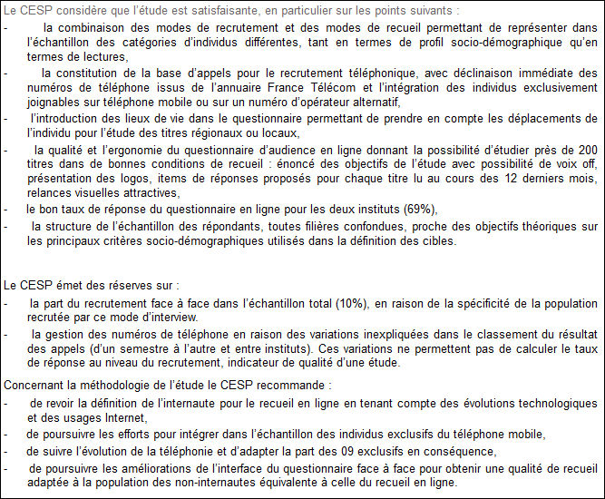 L'exemple d'une synthèse des résultats de l'audit CESP sur l'étude ONE qui mesure l'audience de la presse :