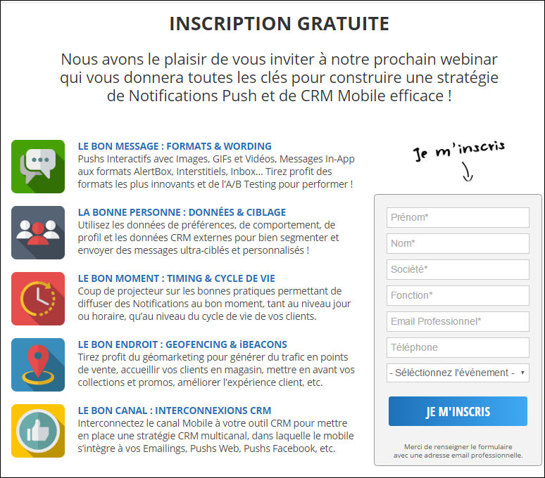 Un exemple de repère visuel (visual cue) combinant texte et symbole graphique sur une page d'inscription à un webinar :
