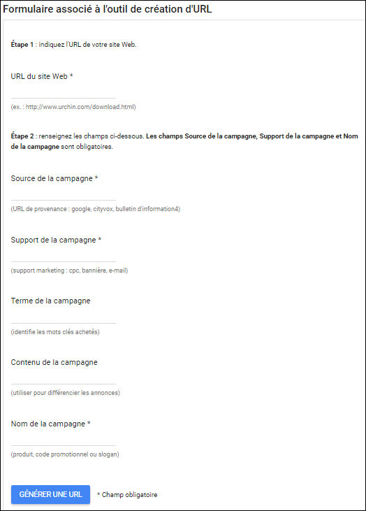 Le générateur d'URL de campagne est un petit outil gratuit proposé par Google. Il permet de nommer le lien à tracker et de le catégoriser. Il ajoute des paramètres d'URL au lien à tracker qui permettent ensuite de récupérer les performances du lien dans les données de campagne de Google Analytics.